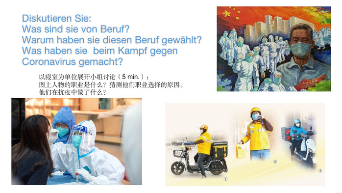 外國語學院的朱俊俏老師從細微處入手,著眼學生關注的話題,在《基礎德語2》課上,基于學生一般都為零基礎,在有限的課時學習中,能用于表達的內容相對偏少,朱老師聯系實事,聚焦疫情下的職業選擇,讓同學們“有話可說”。通過“大白”、外賣小哥的圖片以及“抗疫”、“奮戰”等關鍵詞,朱老師一步步帶領學生了解不同職業的工作內容和職業行為,引導學生了解不同職業的道德要求。課堂上,朱老師對學生職業選擇的理由進行提問,引導學生在今后進行職業選擇時,把個人的未來自覺地融入國家和社會的需要之中。