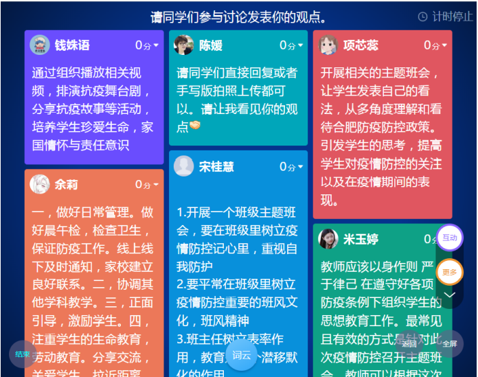 志不求易者成,事不避難者進。“盡管線上教學的難度大于線下教學,但一切困難都是可以克服的。”教育學院的陳媛老師說道。作為教育學院小學教育的專業負責人和專業課的任課教師,陳媛牢固樹立責任意識和使命意識,忠實履行教書育人職責,積極探索疫情期間課程思政在線上教學的實踐路徑。本學期陳媛教授的課程為《班級管理》,在合肥疫情防控和學校抗“疫”過程中,學生們變成了親歷者和參與者,這些身邊事成為陳老師線上教學最有意義的“導入案例”。她從合肥市疫情入手,帶領同學們思考“在當前合肥市眾志成城抗擊疫情的背景下,小學班主任如何在班級管理中,運用疫情防控中的德育元素落實立德樹人根本任務”。話題一經發布,這些未來的“青年教師們”在“云端”課堂里紛紛出謀劃策,一時間掀起了一股討論的熱潮。從“學生”到“老師”,從“遵守者”到“管理者”,角色互換中,同學們深入體會到疫情防控工作的不易,真切感受到抗擊疫情中所表現出的中國力量、中國精神和中國擔當。