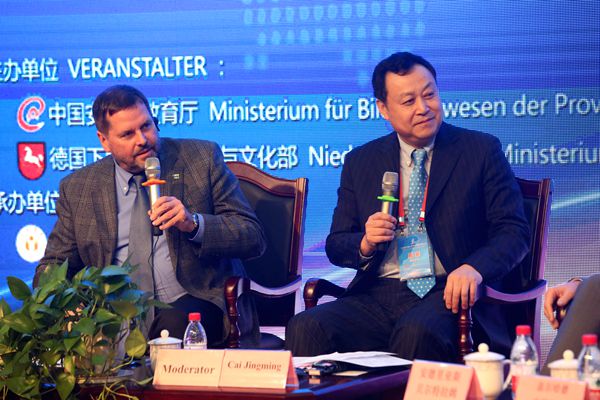 蔡敬民緊扣應(yīng)用型大學(xué)的變革與使命這一主題,再次提問德國(guó)校長(zhǎng),代表如何看待“雙元制”以及德國(guó)應(yīng)用科學(xué)型教育在未來的發(fā)展方向?是以提高學(xué)歷為主還是實(shí)際運(yùn)用為主?巴格丹教授表示,在雙元制下,提高學(xué)歷與實(shí)際運(yùn)用并不矛盾,基礎(chǔ)研究和應(yīng)用研究都很重要。在體系建設(shè)問題上,德方建議,中國(guó)應(yīng)在發(fā)展中逐步完善應(yīng)用型高等教育體系,讓應(yīng)用型高校參與博士教育,改變框架,爭(zhēng)取更好的教育條件。