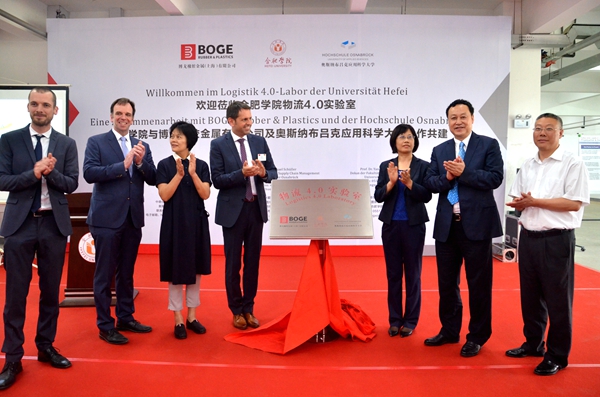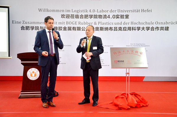 在由合肥學院、德國奧斯納布呂克應用科學大學及德國BOGE公司合作共建的“物流4.0”實驗室揭牌儀式上,合肥學院黨委書記蔡敬民致辭,對德國下薩克森州經濟代表團的到來表示由衷的歡迎。蔡敬民回憶了我校與德國奧斯納布呂克應用科學大學的合作歷史,兩校30余年來在師生交流、科研合作、骨干教師培養、國際會議合作等領域開展有全方位的合作。兩校共同申報的中德合作物流管理本科專業更是成為教育部批準的安徽省首個中外合作辦學項目。此次中德合作“物流4.0”實驗室的建立,旨在進一步拓展校企合作領域,增強學生專業實踐能力。他表示,合肥學院愿意繼續為中德高校及企業間的合作不斷發揮優勢。德國BOGE(中國)公司代表王爾明對公司研究領域以及產能運營狀況做了簡單介紹。他提到,公司對 BOGE “工業4.0”現代化企業物流體系與中德合作“物流4.0”實驗室之間的合作充滿期待,并邀請到場嘉賓訪問BOGE公司、歡迎合肥學院學生赴BOGE公司就業。該實驗室學術主任格斯寧博士就實驗室具體情況、學生參與物流工具設計與控制的方式以及該實驗室基礎上課程與實踐的深度融合等內容做了深入介紹。隨后,在場中德嘉賓共同為中德合作“物流4.0”實驗室揭牌。