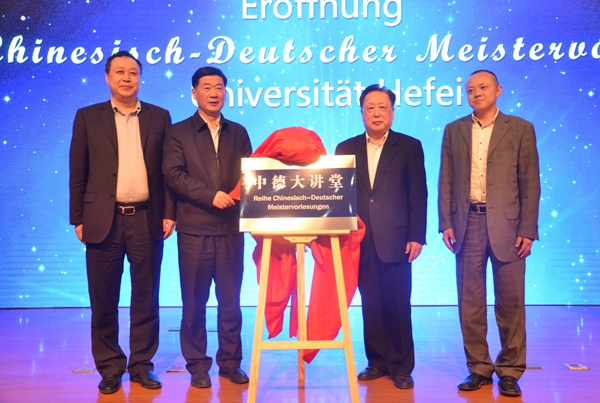 講座結(jié)束后,梅兆榮、慶承松、蔡敬民及秦俊峰四人為“中德大講堂”揭牌。