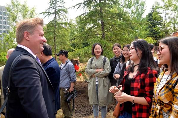 會后,格龍德與我校德語專業師生進行了熱切交談。賓主一行在我校二期校區共同種下了象征兩國友誼的常青樹,并在樹前合影留念。