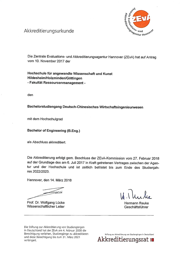 據悉,學校于2017年7月與德方合作學校希爾德斯海姆/霍爾茨明登/哥廷根應用科學大學共同向德國中央評估與認證機構提出關于雙方合作的經濟工程專業認證申請。德國中央評估與認證機構組織相關專家在前期材料審核基礎上,于2017年11月23日通過現場調查、訪談、資料核查以及視頻會議等多種形式對中德合作經濟工程專業進行全方位評估認證。