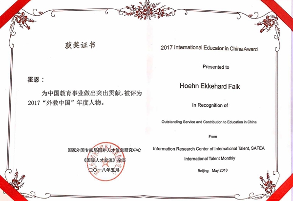 特別值得一提的是,2017“外教中國”年度人物評選出了一批優秀的外國文教專家。在典禮現場,我們通過故事講述人、中央人民廣播電臺十佳主持人馬宗武的傾情講述,了解到他們許多感人至深的故事。我校的副院長、2014年中國政府友誼獎獲得者霍恩教授獲得了此獎項,并由他的的女兒霍泰莎來到清華大學代替他領獎發言,她發言時說道他父親小時候拍的一張讓它她父親至今難忘的照片,那是他父親十幾年前在合肥市黃山路與金寨路交口拍的一張照片,偌大的路口只有一兩輛汽車,如今這里車水馬龍,而且還建了高架橋。他父親說這只是合肥乃至安徽近年來快速發展、活力迸發、開放創新的一個縮影。獲得此獎項的還有來自意大利的布魯諾·布里斯杰拉,現任福州大學土木工程國際化示范學院外籍院長,也是2013年中國政府友誼獎獲得者外專項目專家,大連楓葉國際學校加方課程教師凱麗·特麗薩·克雷默,西北工業大學教授、美國國家工程院院士、曾兩次獲得諾貝爾獎提名的克日什托夫·馬蒂亞謝夫斯基,中國工程院外籍院士、鄭州大學醫學科學院院長尼古拉斯·羅伯特·萊蒙,北京大學教授約翰·扎卡賴亞斯,電子科技大學教授孟睿思,北京外國語大學客座教授、知名漢學家沃爾夫岡·顧彬,中國人民大學教授、美國科學與社會學院院士唐納德·沃斯特,四川外國語大學阿拉伯語語言文學教授賽勒瑪·伊布拉欣等。
