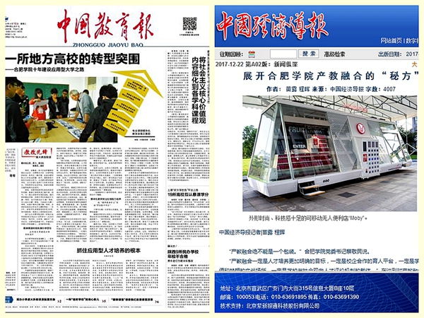 合肥學院理念和經驗獲得同類高校普遍認同,改革實踐獲得社會高度關注。新華社《國內動態清樣》《人民日報》《光明日報》《中國教育報》《中國經濟導報》等媒體近百次報道。2014年,學?!锻黄茖W科定勢 構建模塊化課程 重構能力導向的應用型人才培養教學體系》課題獲國家級教學成果一等獎,填補了安徽省屬高校國家級教學成果獎一等獎的空白。2016年,學校獲第四屆全國教育改革創新特別獎?!吨袊逃龍蟆奉^版以“一所地方高校的轉型突圍”“安徽:高?!皯谩敝涝阶咴綄挕薄?/span>安徽地方本科高校向應用型轉變:從自發到自為”等文章接連介紹了學校建設應用型大學經驗。2017年,學校成為全國百所“十三五”產教融合發展工程單位之一、國家高等教育智庫聯盟成員單位、國家新工科教育與研究成員單位和全球中小企業聯盟戰略合作伙伴,掀開發展新篇章。