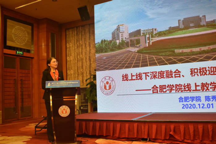 陳秀以《線上線下有機(jī)融合、積極迎接“新教育形態(tài)”:合肥學(xué)院線上教學(xué)的實(shí)踐與探索》為題作報(bào)告。她從新時(shí)代中國高等教育發(fā)展面臨新形態(tài)、疫情期間合肥學(xué)院線上教學(xué)實(shí)踐回顧、未來探索線上線下深度融合的新思路這三個(gè)方面作了詳細(xì)匯報(bào)。陳秀提到“金課”和“一流課程”兩個(gè)關(guān)鍵詞,展示了疫情防控背景下在線教育教學(xué)的工作思路,總結(jié)了疫情期間合肥學(xué)院線上教學(xué)六大創(chuàng)新做法。