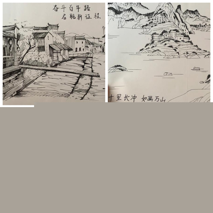 在完成金絲皇菊的包裝設(shè)計和周邊文創(chuàng)產(chǎn)品設(shè)計后,團隊成員還舉辦了主題為“禮贊建黨百年,書畫美麗鄉(xiāng)村”的慶祝建黨100周年書畫和手工作品展。同學們緊扣“農(nóng)業(yè)、農(nóng)村、農(nóng)民”主題,突出建黨100年來我國農(nóng)村翻天覆地的變化?;顒又校蠹覝蕚淞烁魇礁鳂拥墓ぞ?,如超輕粘土、卡紙、膠水等等,充分發(fā)揮專業(yè)特長,在三天時間內(nèi)完成了繪畫、書法、手工作品共60余件,準備近期在萬山鎮(zhèn)文化館展出。
