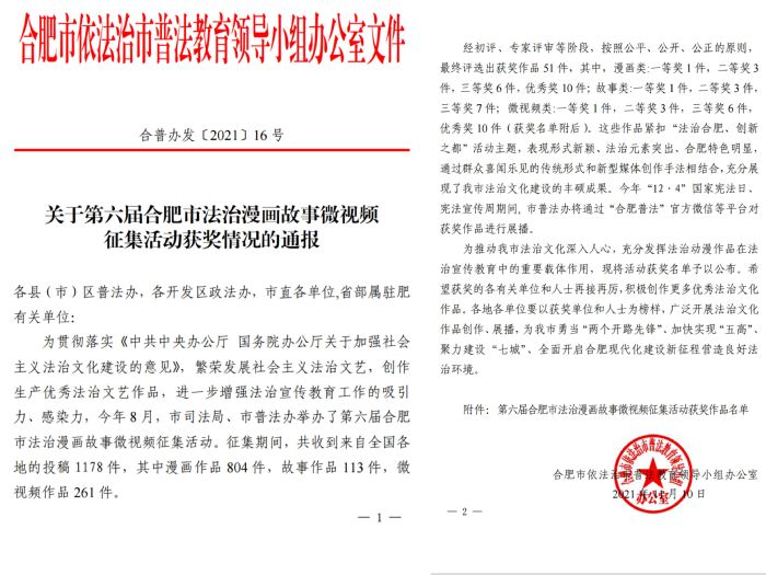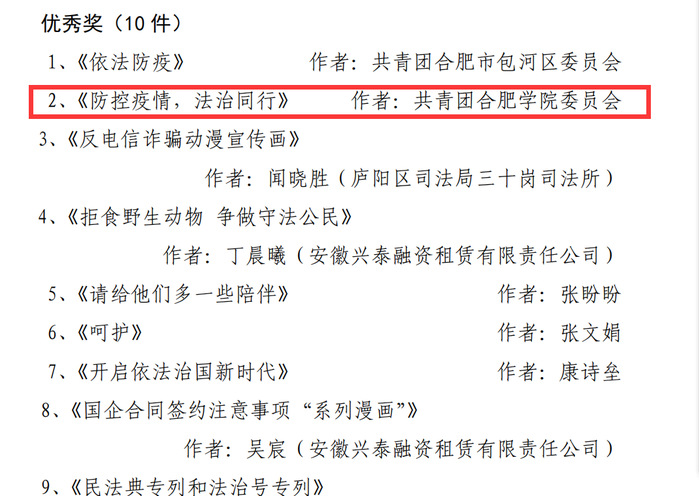 日前,第六屆合肥市法治漫畫故事微視頻活動獲獎名單公布,我校作品《防控疫情,法治同行》榮獲漫畫類優秀獎。