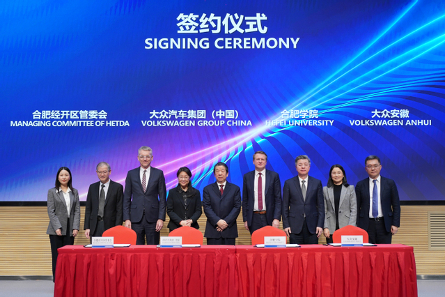 Um die tiefe Integration von Industrie und Bildung, die Zusammenarbeit zwischen den Universit?ten und den Unternehmen sowie ein Vorbild für eine Hochschulkooperation im dualen System zu schaffen, fand am 20. Februar im Innovationspark für chinesisch-deutsche Zusammenarbeit in Hefei die feierliche Unterzeichnungs- und Einweihungszeremonie des Volkswagen-Instituts statt. Jens Pfitzinger, exekutiver Vizepr?sident der Volkswagen Group (China), Erwin Gabardi, CEO von Volkswagen (Anhui) Co., Ltd, Wang Qidong, Sekret?r des Parteikomitees der Universit?t Hefei, Lu Jun, Mitglied des St?ndigen Ausschusses des Parteikomitees der Stadt Hefei, und Chu Changlian, Mitglied des Arbeitsausschusses für Bildung des Parteikomitees der Provinz und stellvertretender Direktor der Bildungsabteilung der Provinz Anhui, nahmen daran teil und hielten Reden. Die Einweihung wurde von Wu Chunmei, Pr?sidentin der Universit?t Hefei, moderiert.
