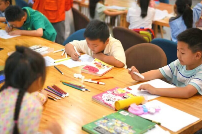 七彩假期,不僅僅局限于傳播課堂知識,更要以美育人、以文化人,提高學生審美能力和人文素養。依托于“悅書房”的教學地點,小朋友們天馬行空的想象力得到了充分的展示。五彩斑斕的顏色綻放于畫作上,一顆顆美育的種子也埋進了小朋友們的心里。志愿者充分尊重學生的個性差異,以多樣化的教學方式引起學生的鑒賞興趣,帶領小朋友們欣賞經典曲目《梁祝》《致愛麗絲》等。從美術到音樂,從課堂到生活,或淺或深的感悟留在每個人的心中,又創造出新知。