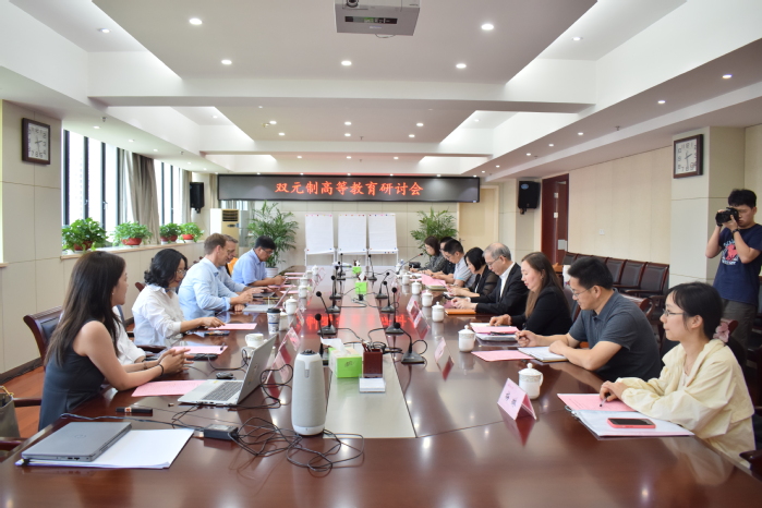 Am Nachmittag des 28. Mai fand an der Universit?t Hefei das Symposium für duale Hochschulbildung (Contiklasse-Projekt) statt. Professor Lange und Professor Schmidt, die Verantwortlichen des dualen Projekts der Hochschule Emden/Leer, sowie die Verantwortlichen des dualen Bildungsprojekts und der Personalabteilung der Continental AG nahmen am Symposium teil. Auch Wang Qidong, Parteisekret?r der Universit?t Hefei, sowie Verantwortliche der relevanten Abteilungen und Fakult?ten der dualen Contiklasse der Universit?t Hefei waren anwesend.