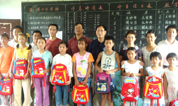 隨后,院領導趙良慶、丁明,院團委副書記宣文、外文系副主任夏蓓潔還代表合肥學院向盤石小學和10名貧困生捐贈了一臺彩電和書包等學習用品。