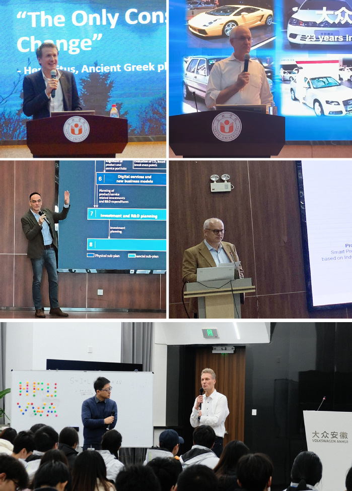 2023-2024學年第一學期,大眾學院聯合大眾安徽舉辦了5次企業客座教授理論授課與認知實習活動。學校客座教授、大眾安徽首席執行官葛皖鏑博士、首席財務官哈約根博士、首席技術官呂爾曼博士、首席數字官高樂夫先生和首席制造官施耐德先生,為學生進行精彩授課。