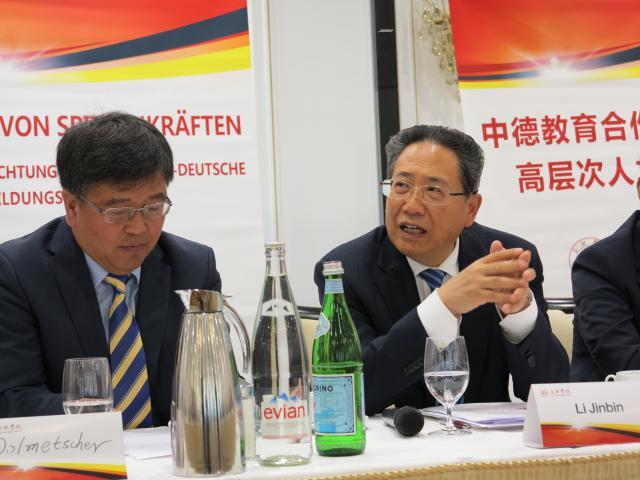 Am Vormittag des 14.06. fand ein Treffen von Spitzenkr?ften der Modelleinrichtung der Bildungskooperation zwischen China und Deutschland in Hannover statt. Prof. Dr. Cai Jinmin, Parteisekret?r der Universit?t Hefei, hielt dabei eine Rede. Dr. Li Jinbin rechnete in seiner nachfolgenden Rede der Universit?t Hefei hoch an, dass sie als Brücke bei der F?rderung der chinesisch-deutschen Bildungskooperation eine wichtige Rolle spiele. Er zitierte Ministerpr?sident Li Keqiang und teilte seine Hoffnung, dass die Kooperationen der Universit?t Hefei auch in Zukunft, so w?rtlich ?wie ein starker Baum mit tiefen Wurzeln“ sein m?gen.