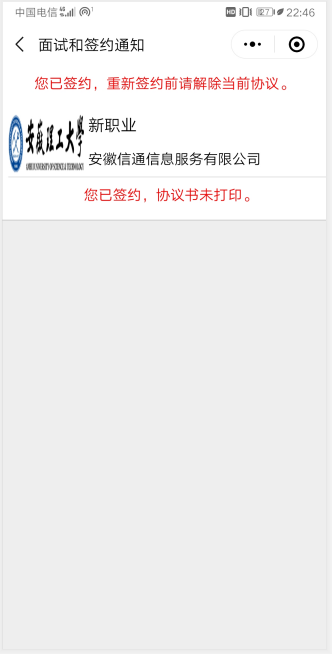 簽約成功后,簽約狀態為“簽約成功,待學校審核”,就業協議書不能打印。