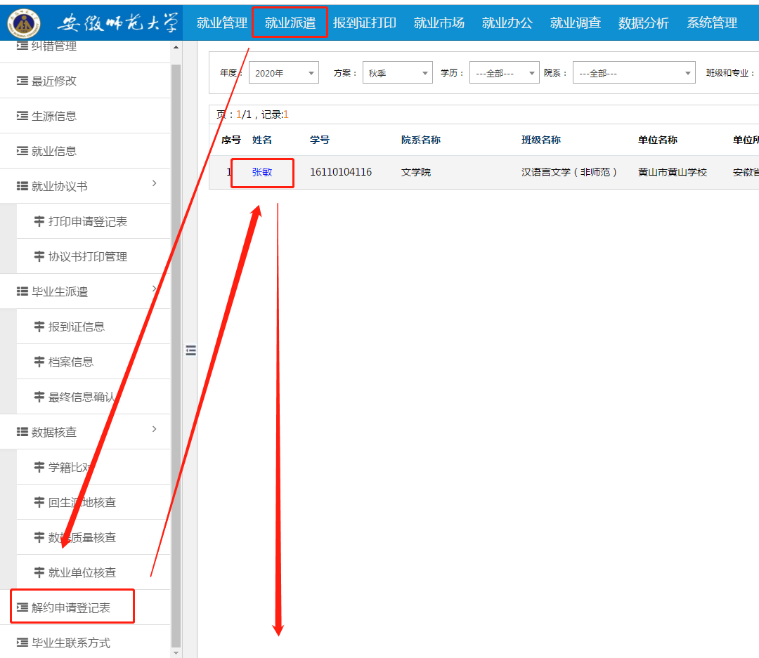 第二步、輔導員進入系統,點擊上方“就業派遣”,再點擊左下角“解約申請登記表”,點擊申請學生姓名,進入審核頁,點擊“同意毀約”或“不同意毀約”即可。