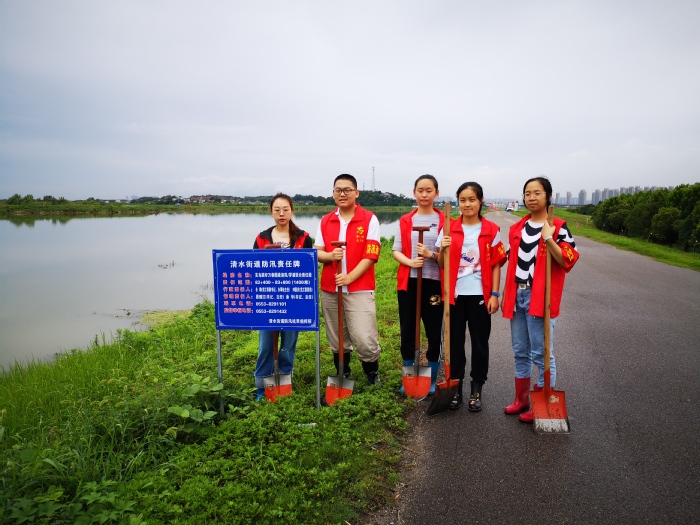 我是受爸爸的影響去參加防汛工作的,他是清水街道辦事處的一名辦事員。從汛情開始,整個街道辦事處都處于異常嚴峻的形勢下,爸爸和他的同事們來到各個防汛值班點,每天巡堤并做記錄,檢察工作的落實情況,查看搶險物資是否分配到位,每兩天或一天值一次晚班,密切觀察堤點情況。當我看到爸爸和他的同事,以及自愿參與巡堤的那些經驗豐富的老人們夜以繼日地守著我們的一寸土地,我內心大為觸動,于是主動申請擔任志愿者,一起守護我們來之不易的家園。