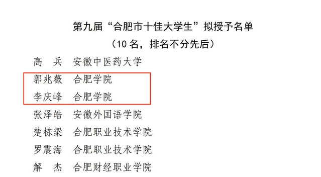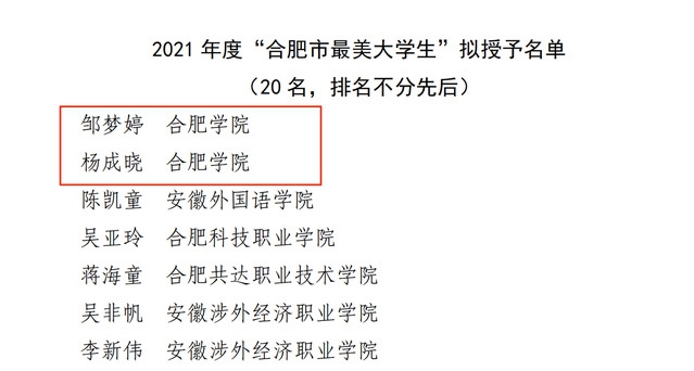 近日,由合肥市教育局、共青團合肥市委員會、合肥市學生聯合會共同舉辦的尋訪2021年度“合肥市最美學生”暨第九屆“合肥市十佳學生”評選活動結果公布,我校學子郭兆薇、李慶鋒榮獲“合肥市十佳大學生”稱號,鄒夢婷、楊成曉榮獲“合肥市最美大學生”稱號。