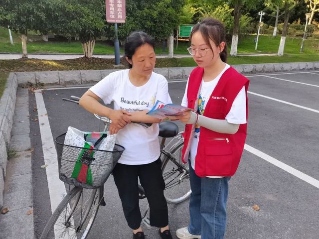 在紅軍廣場,調研團隊成員就金寨縣鄉(xiāng)村振興政策對紅軍廣場周邊居民進行社會調研及宣傳,并發(fā)放黨史學習與疫情防控宣傳手冊。