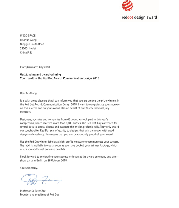 The Red Dot competition this year has received 8,610 designs from 45 countries. Ms. Xiangs work, Brand Vision-system Design for Qianlingshan Zoo, is completed after modifications during over 8 months time. When formally put into the market, it is well accepted by Guiyang Eco Committee, the Zoo and the public.