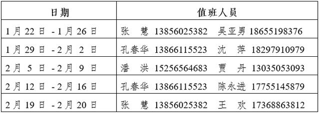 三、寒假期間安排值班,請各科室根據工作分工和學校重點工作合理安排時間,遇有突發事件,要按規定及時報告并妥善處置,確保學校安全穩定,具體排班表如下: