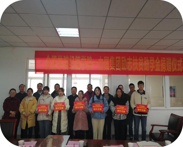 2020年12月11日,合肥學院經管學院--力聚集團勵志扶貧助學金捐贈暨校企合作簽約儀式于我校一區博學樓B座二樓會議廳順利舉行。參加本次儀式的企方人員有力聚集團黨總書記陳邦勤、財務總監兼財務支部書記姚國強、人事總監兼總支委員周龍海及財務部的邵瑩瑩、劉薈和左甜甜;校方人員有經管學院院長陳江華、黨委書記楊學春、安徽中德教育合作基金會主任劉金平、經管學院副院長宋玉軍、黨委副書記張永軍、財會系副主任鄭姍姍、經管學院團總支書記姚璇、會計教研室主任袁宏穩及受資助的學生。會議由副院長宋玉軍主持。