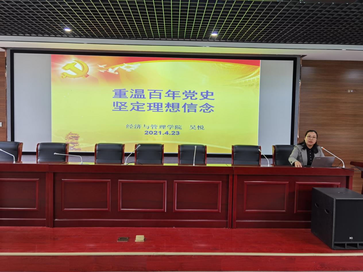 為慶祝中國共產黨百年誕辰,學習百年黨史輝煌歷程,20201年4月23日,經濟與管理學院舉行教工黨支部先鋒大講堂系列第九講。此次大講堂由我院黨委委員、副院長吳悅擔任主講人,各支部學生黨員參與學習。