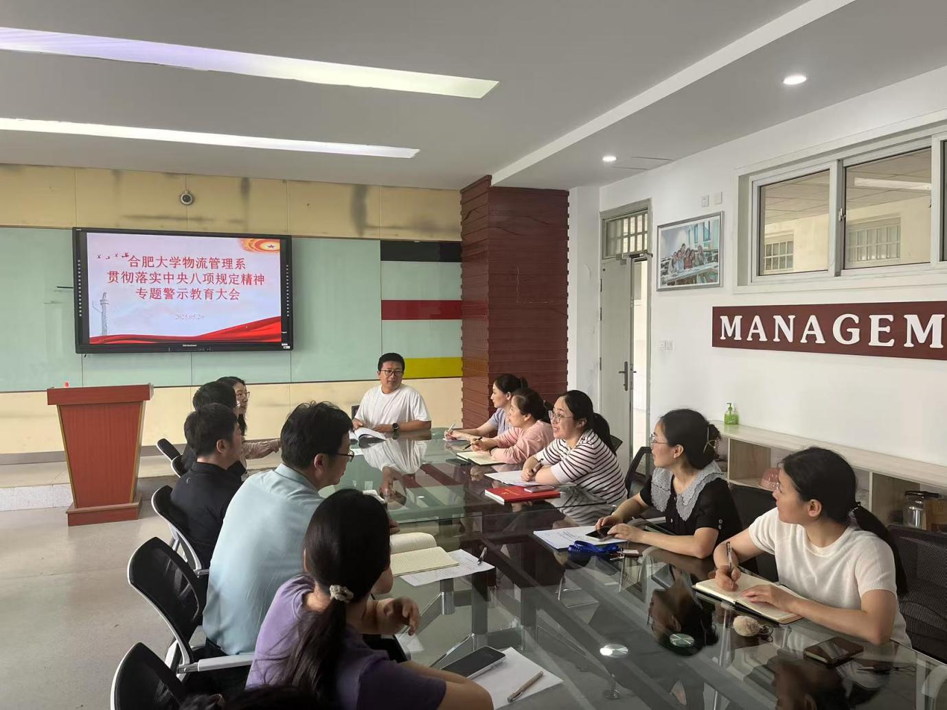 會上,胡中峰首先傳達了《合肥大學深入貫徹中央八項規定精神學習教育工作方案》、《合肥大學經濟與管理學院深入貫徹中央八項規定精神學習教育工作方案》精神,結合《違反中央八項規定及其實施細則精神典型案例》,開展以案說德、以案說紀、以案說法、以案說責,并結合系部工作實際剖析反面典型案例,強調全系教師必須以案為鏡、反躬自省,切實將中央八項規定精神轉化為思想自覺和行動自覺,持續鞏固深化學習教育成果,將中央八項規定作為長期有效的鐵規矩、硬杠杠,推動作風建設常態化長效化,為物流管理系各專業高質量發展提供堅強紀律保障。 (經濟與管理學院 撰稿:胡俊迎 初審:胡中峰 復審:余宏強 終審:倪澤強) |