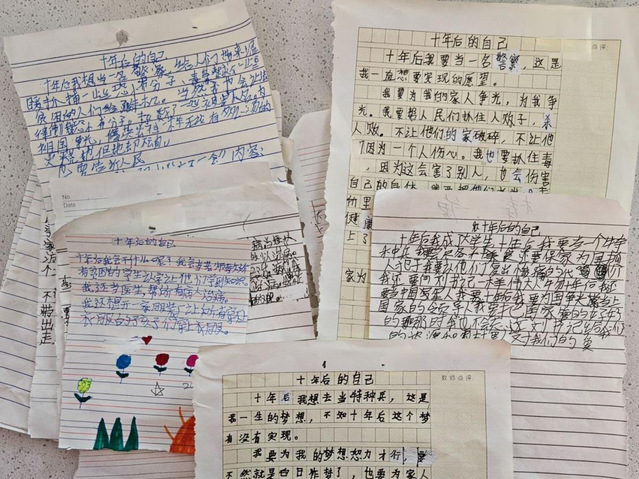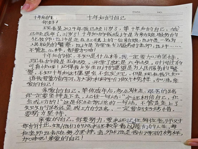 在信中,一位五年級的同學寫道:“十年后的自己,你好!十年后的自己,我已經成年了,21歲了!十年的我或許是為新娘服務的化妝師,也許是一名為人民服務的警察;也許是為學生們服務的老師;也許……不管怎么樣,都要加油!十年后的你,不知是什么樣,我一定要加油堅持。現在的我是五年級,開學了就是六年級,時間的可真快呀!記得我10歲生日許的愿望是為人民服務的警察,不知十年后這愿望會不會實現,現在我只知道我要努力學習,為大家做榜樣,加油!”