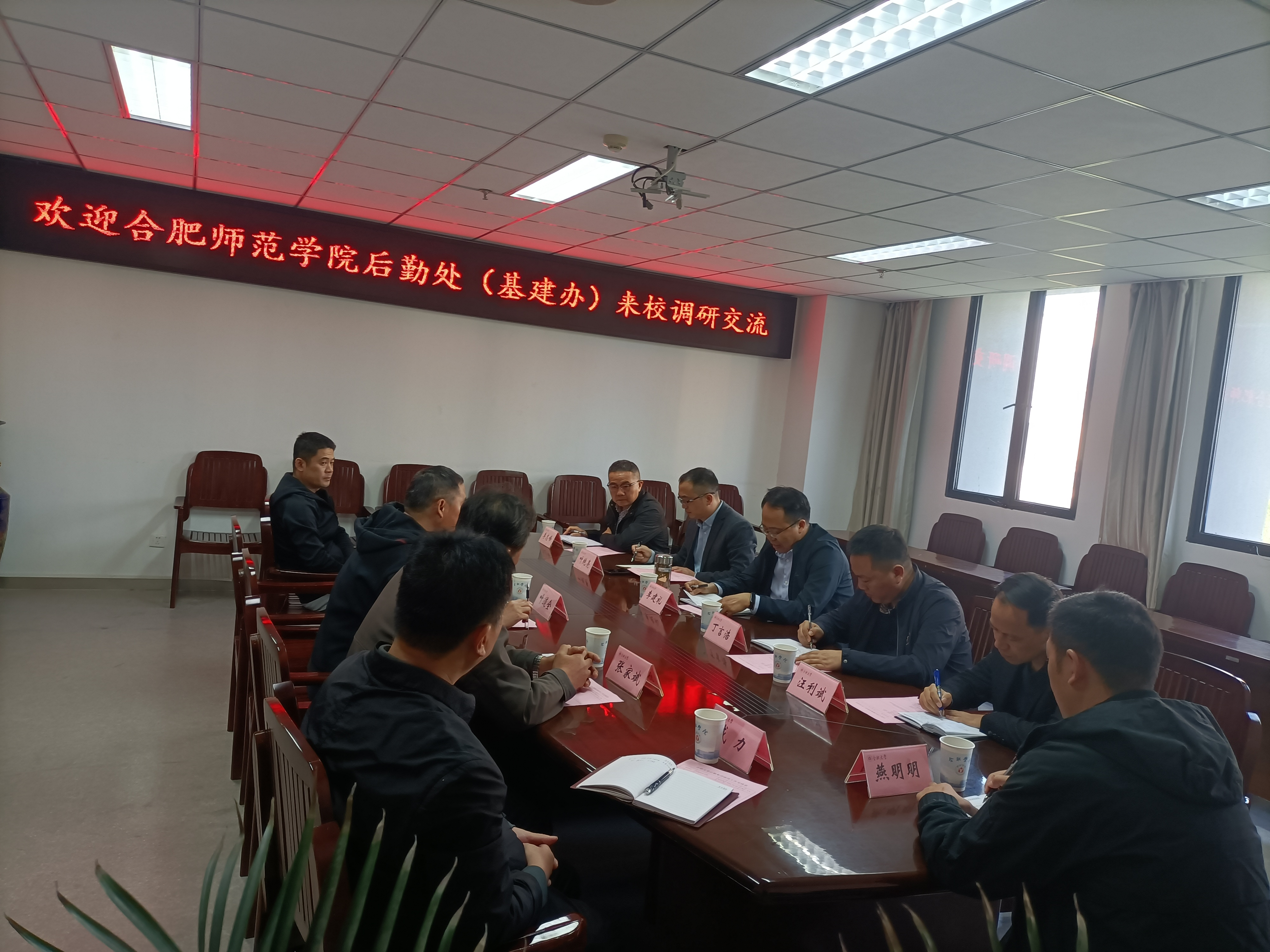 合肥師范學院后勤處(基建辦)處長李建禮、副處長丁言浩一行1024上午9:00來學校調研交流。后勤集團相關人員參加交流,后勤集團經理葉道全主持會議,并對李建禮處長一行的到來表示歡迎。
