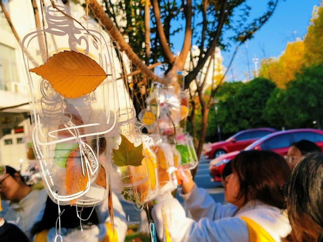 下午兩點(diǎn),活動(dòng)準(zhǔn)時(shí)開始,同學(xué)們有序領(lǐng)取瓶罐狀的透明書簽,尋找有關(guān)秋的物品,裝飾瓶狀書簽并將其掛在樹間捆綁的麻繩上。同時(shí),同學(xué)們在展板上盡情創(chuàng)作,粘貼樹葉、書簽,留下愿望和感想,共同創(chuàng)作了一幅秋日畫卷。