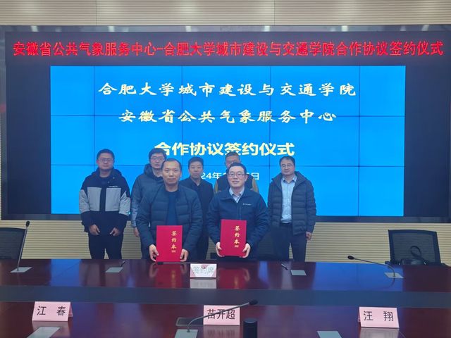 2024年1月26日,合肥大學城市建設與交通學院黨委書記張永軍、副院長祝磊和安徽省智慧交通大數據分析與應用工程實驗室執行主任肖赟一行前往安徽省公共氣象服務中心開展科研項目交流,并舉行了產學研戰略合作簽約儀式。安徽省公共氣象服務中心主任苗開超,副主任江春,以及汪翔、周建平科長參加了簽約儀式。會議由省氣象公共服務中心主任苗開超主持。
