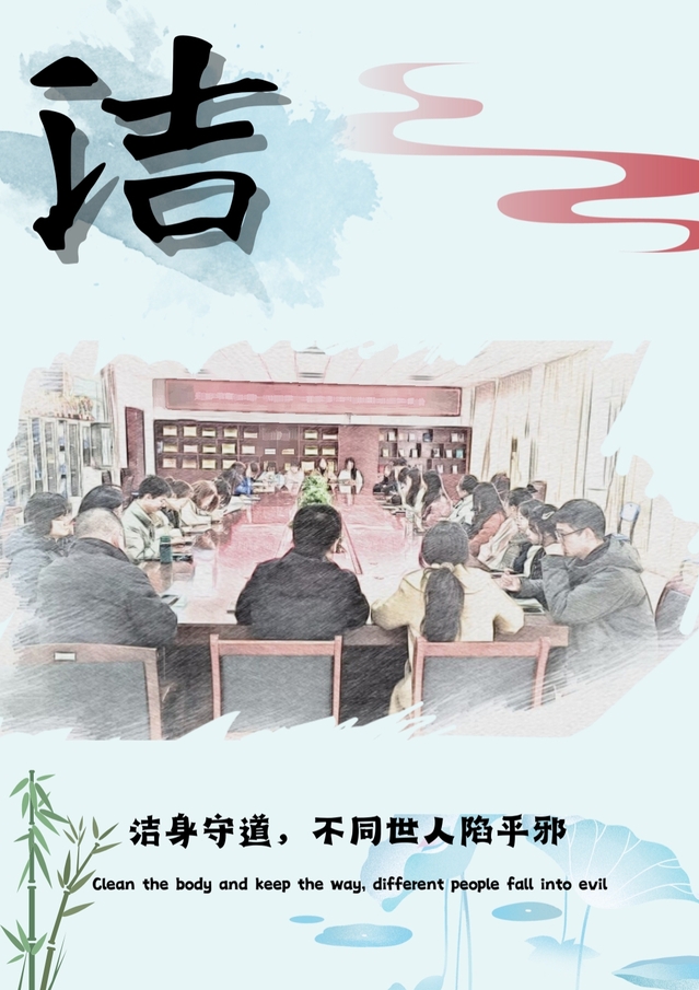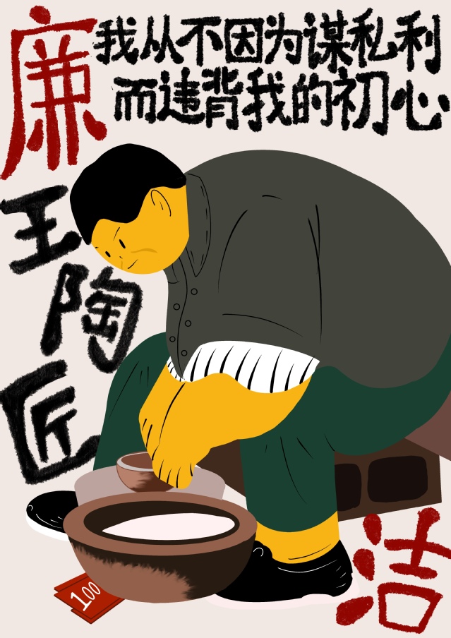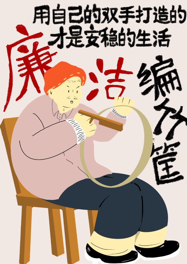 作品圍繞“反腐廉潔”進行創作,運用了三位手工藝人的形象對貪污腐敗的人進行反諷;將腐敗不正之風的人不會有的生活方式直接寫了出來,同時使用扁平畫的風格將生活中最樸素人物的真實的狀態表現出來,字體偏手寫風格,充滿親和力,“廉潔”兩字使用紅色更加突出。