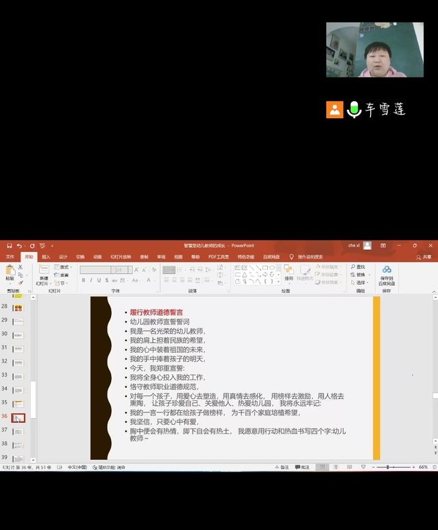 車雪蓮老師首先通過三個案例的講解,給學生展示了智慧型教師的魅力。然后通過智慧型教師的內涵、智慧型教師的成長軌跡、智慧型教師的養成三個層次向學生們介紹了“智慧型教師“,深入闡述了成為一名智慧的教師應及時知曉孩子語言、行為、表情等的深層含義。并告訴同學們幼兒教師教書育人就像建房子打地基一樣,前期的理論和技能學習,實踐鍛煉都十分重要。就如幼兒教師要嚴格履行教師道德誓言,幼兒教師應通過不斷學習、不斷反思,給孩子做積極地榜樣,為千百個家庭培植希望。