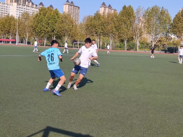 十月十六日下午2:30,合肥學院足球新生杯在二期操場如約舉辦。本場比賽的對陣雙方分別是中外聯隊(教育學院、語言文化與傳媒學院、外國語學院)和管理隊。 隨著主裁判的一聲哨響,本場比賽正式開始。第一球由管理隊員在對方禁區右側擲出界外球,中外球員盯人不緊將球漏入禁區,管理球員頭球攻門,門將站位靠前只能目送足球應聲入網。第二球管理球員在大禁區左側覓得遠射機會,球速不快,但門將脫手沒有抱住足球,失誤導致足球從十指間漏入球網。上半場中外聯隊狀態不佳,兩次失誤讓管理隊抓住機會連入兩球。