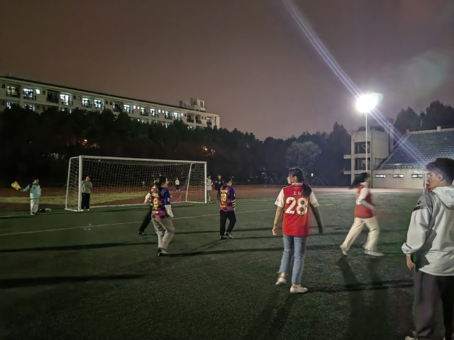 晚八點,隨著裁判的一聲哨響,雖然雙方球員都穿著單薄的球衣,但她們都克服了寒冷,在足球場上飛快的奔跑,并且雙方每個球員都渴望為隊伍拿下第一球,你來我往,互不相讓,使賽場的戰況十分焦灼。比賽過半,設計學院率先拿下本場比賽一球,但教育學院的球員并不氣餒,仍然沉著冷靜,并且互相鼓勵著,一起布下更為嚴密的作戰計劃。賽場上人員的快速移動,我方8號球員張妮,在隊友的掩護下,沖破對方的重重阻攔,踢進了教育學院第一球!這一球使得雙方比分打平,也使得教育學院球員情緒高昂起來,仿佛驅散了操場的寒冷。上半場臨近結束時,教育學院乘勝追擊,18號球員方蝶為教育學院再進一球!最終,上半場由2:1的成績結束。經過短暫的中場休息,球員們互相鼓勵著登上球場,觀眾們也在場下歡呼聲不斷。
