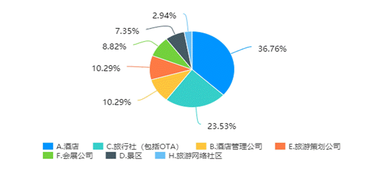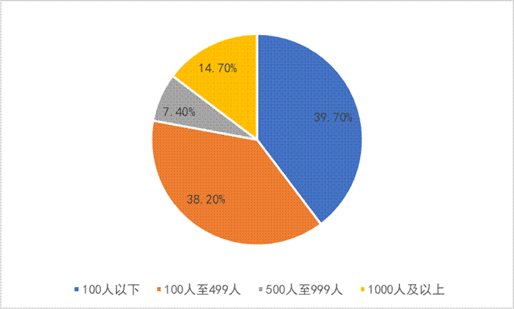 本次調(diào)研參與企業(yè)的業(yè)務(wù)領(lǐng)域涵蓋旅行社(包括OTA)、景區(qū)、旅游策劃公司、旅游網(wǎng)絡(luò)社區(qū)、酒店、酒店管理公司、會(huì)展公司等類型(圖1)。員工人數(shù)為100人以下的企業(yè)占39.7%100人至499人的企業(yè)占38.2%500人至999人的企業(yè)占7.4%1000人及以上的企業(yè)占14.7%(圖2)。不僅覆蓋合肥、黃山、蕪湖、馬鞍山、亳州、淮南、宣城等安徽省內(nèi)城市,還覆蓋北京、上海、深圳、廣州、杭州、臺(tái)州、南京、青島等安徽省外城市。本次調(diào)研邀請企業(yè)總經(jīng)理或者人力資源部經(jīng)理填寫問卷,通過問卷星在線平臺(tái)收集問卷。以下調(diào)查分析結(jié)果,均以本次調(diào)研樣本為基礎(chǔ)的分析結(jié)果。
