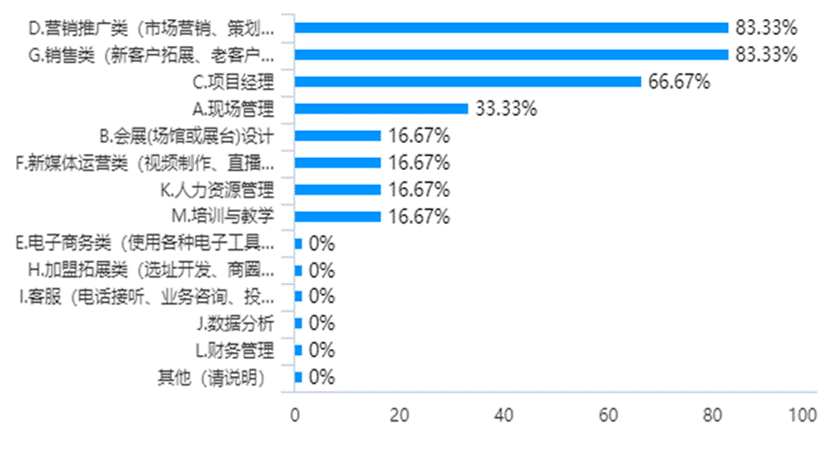 旅游類本科生畢業(yè)后在會(huì)展公司從事的崗位以營銷推廣、銷售、項(xiàng)目經(jīng)理為主,其次是現(xiàn)場管理、會(huì)展設(shè)計(jì)、新媒體運(yùn)營、人力資源管理、培訓(xùn)與教學(xué)(圖6)。