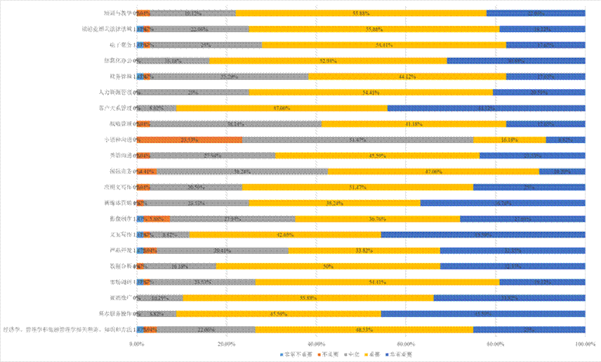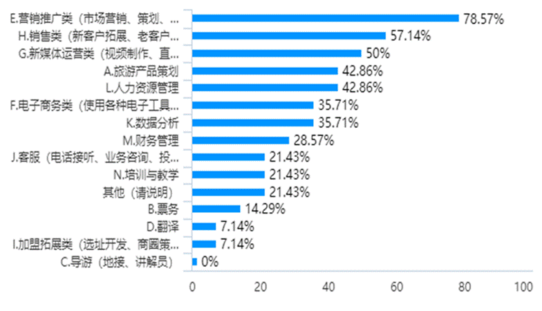 其次是培訓(xùn)與教學(xué)、應(yīng)用文寫作、新媒體營銷、人力資源管理、旅游業(yè)相關(guān)法律法規(guī)、經(jīng)濟(jì)學(xué)、管理學(xué)和旅游管理學(xué)相關(guān)理論、知識(shí)和方法、市場調(diào)研、電子商務(wù)、英語溝通、產(chǎn)品開發(fā)、影像制作、財(cái)務(wù)管理,還包括戰(zhàn)略管理、國際商務(wù),也有少部分企業(yè)看重小語種溝通能力。