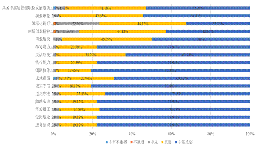 其次是成就意愿、靈活應(yīng)變、職業(yè)形象、具備中高層管理職位發(fā)展?jié)撡|(zhì)、商業(yè)敏銳。官僚主義的層級(jí)結(jié)構(gòu)森嚴(yán),各個(gè)團(tuán)隊(duì)各行其是,無法有效地把握市場機(jī)遇,最終企業(yè)發(fā)展將停滯不前。這些企業(yè)中的微觀管理扼殺創(chuàng)新成果,他們無法快速做出調(diào)整、制定決策或解決問題,因而難以與同行競爭。因此,企業(yè)需要員工思維敏捷活躍,具有創(chuàng)新創(chuàng)業(yè)精神,靈活應(yīng)對(duì)變化,快速做出反應(yīng)。