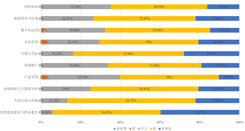 被企業(yè)評(píng)為中立(中等)的表現(xiàn)依次是,產(chǎn)品開發(fā)、創(chuàng)新創(chuàng)業(yè)、營銷推廣、數(shù)字化運(yùn)營、企業(yè)管理、旅游政策與法規(guī)、市場調(diào)研與大數(shù)據(jù)分析、溝通與交際、專業(yè)認(rèn)知與實(shí)踐、思想道德素質(zhì)與職業(yè)素養(yǎng)。