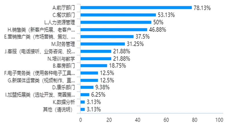 旅游類本科生畢業(yè)后在酒店、酒店管理公司從事的崗位以前廳部門、餐飲部門、人力資源管理為主,其次是銷售、營銷推廣、財(cái)務(wù)管理、客戶服務(wù)、培訓(xùn)與教學(xué)、客房部門,還有電子商務(wù)、新媒體運(yùn)營、康樂部門、加盟拓展、數(shù)據(jù)分析等崗位(圖5)。