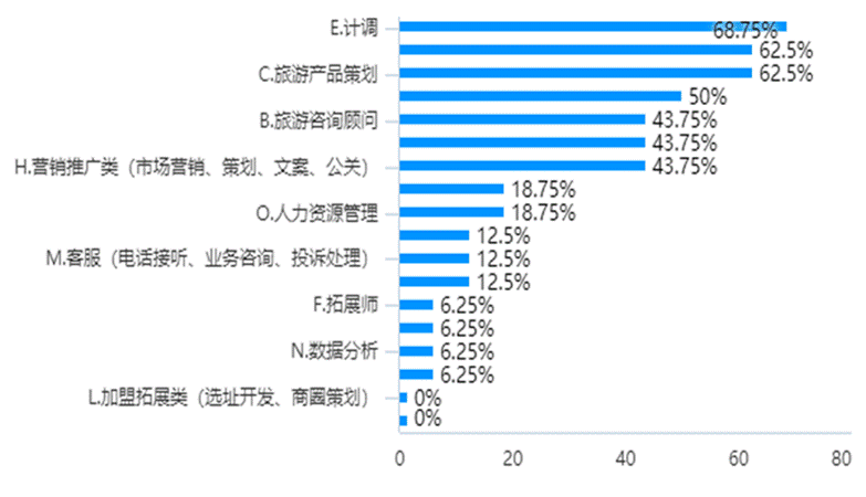 旅游類本科生畢業(yè)后在旅行社從事的崗位以計(jì)調(diào)、旅游產(chǎn)品策劃、旅游咨詢顧問為主,其次是營銷推廣、人力資源管理、客戶服務(wù),還有拓展師、數(shù)據(jù)分析等崗位(圖3