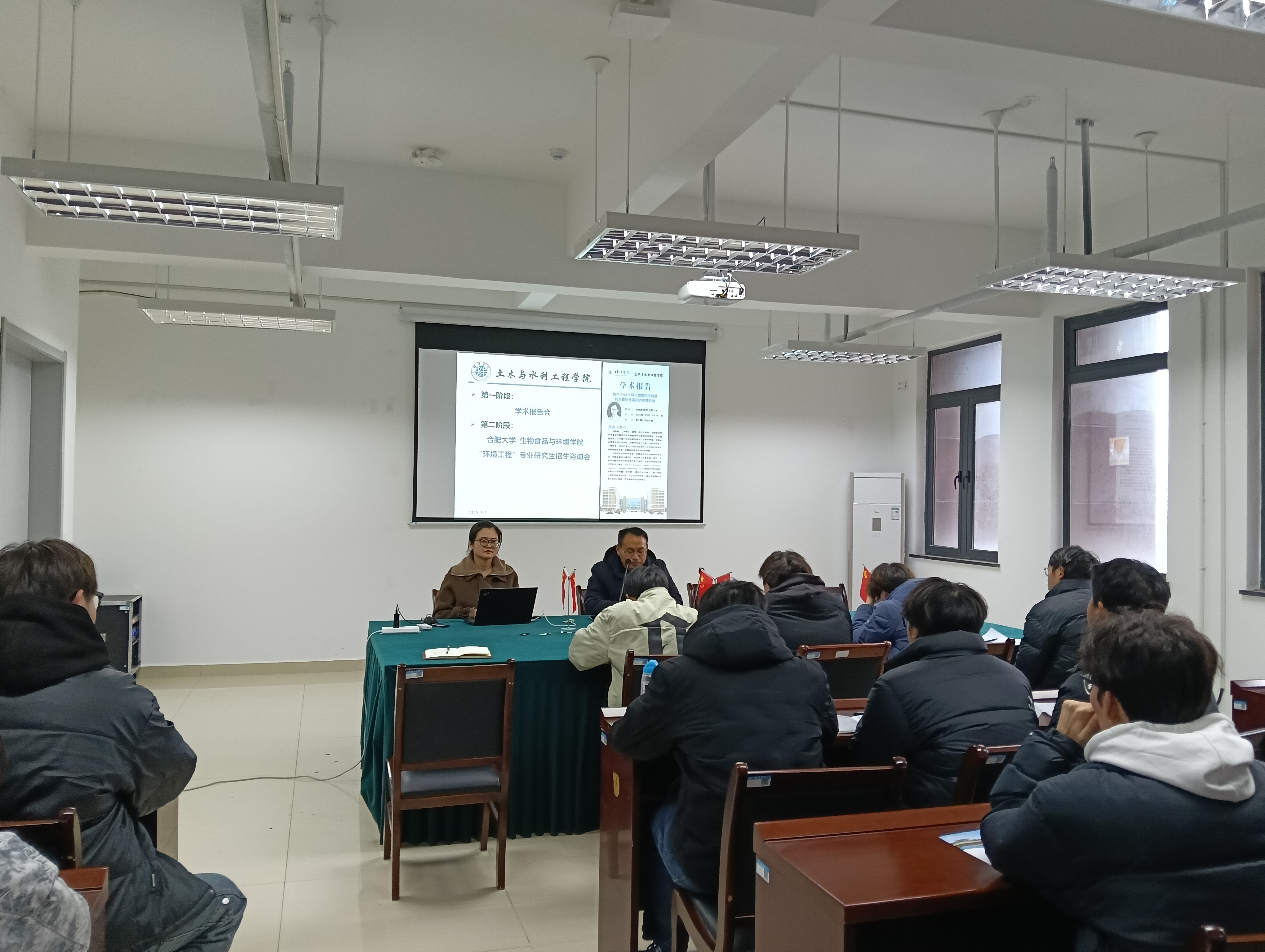 在蚌埠學院,食品與生物化工學院楊俊老師、土木與水利學院副院長朱蘭保和水利工程系黨支部書記潘爭偉接待并精心安排了宣講場所與參會學生,宣講對象主要為相關專業的大三和大四學生。在宣講過程中,環境與資源碩士點負責人劉曉薇從專業特色、科研項目及國際合作等方面進行了介紹,強調該專業在環境污染治理、資源循環利用及生態修復等前沿領域的研究優勢。食品營養與健康碩士點負責人肖青青詳細介紹了該專業的培養目標、課程設置、研究方向、招生計劃、科研項目成果及就業前景,并指出該專業緊密結合國家“健康中國”戰略需求,致力于培養復合型人才。此外,宣講團隊還詳細解讀了生物與醫藥和生物工程兩個專業的招生計劃、研究方向及培養模式,強調產學研結合和創新能力培養。