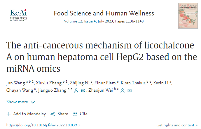 近日,我校生物食品與環境學院食品科學專業青年教師王郡博士在國際食品科技研究領域頂級期刊《FoodScience and HumanWellness》(食品科學與人類健康)(IF2022=8.022,中科院農林科學Q1,食品科技Q1)在線發表了研究論文,該論文的題目為《Theanti-cancerous mechanism of licochalcone A on human hepatoma cellHepG2 based on the miRNAomics》(基于miRNA組學研究甘草查爾酮A對人肝癌細胞HepG2的抗癌機制)。該研究在miRNA組學水平上解析甘草活性成分——甘草查爾酮A對人肝癌細胞HepG2的抗癌作用,為清晰認識到甘草的營養價值和藥理學作用提供了新的視角。