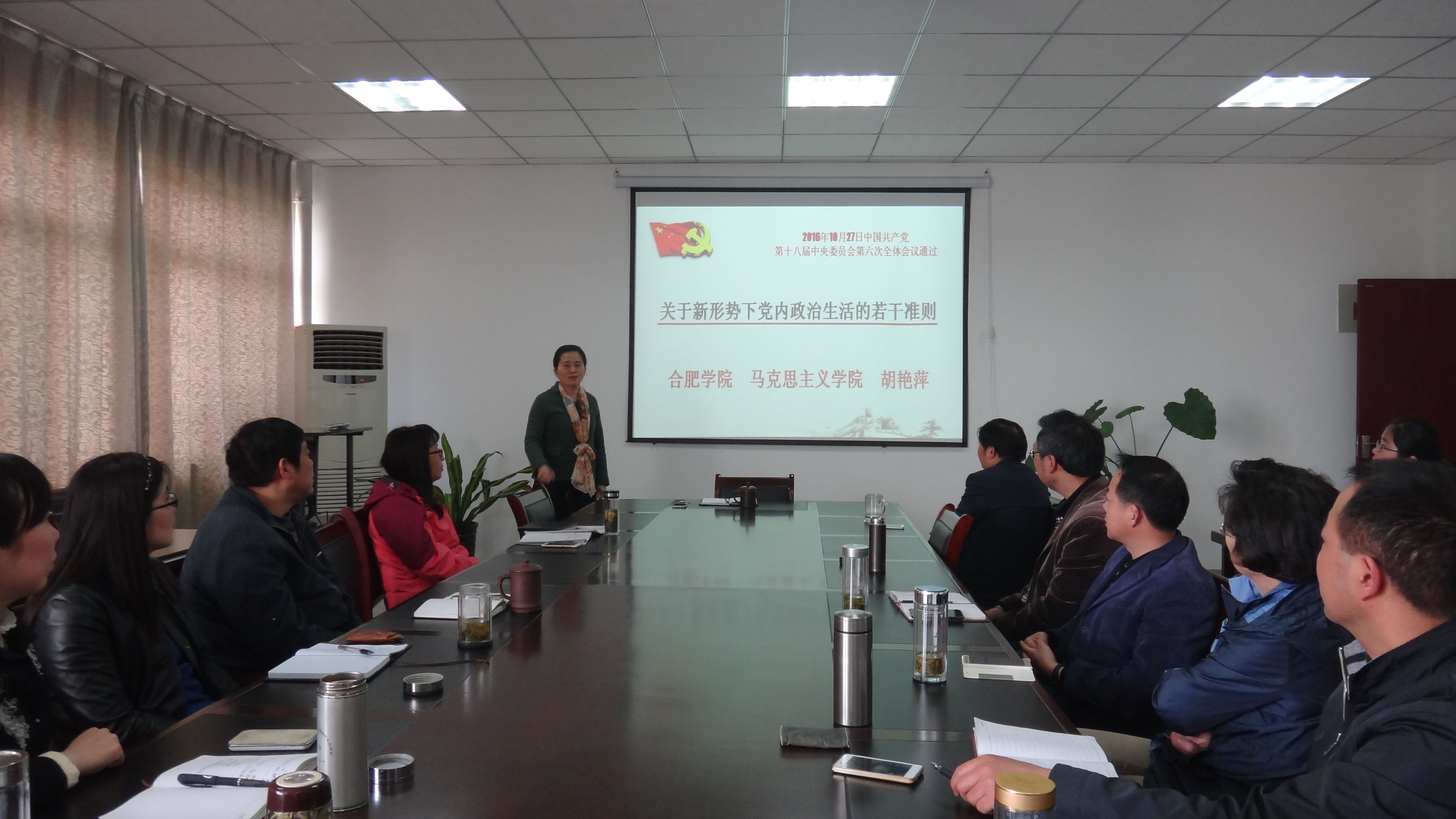 為深入學習十八屆六中全會精神,4月12日下午,馬克思主義學院集中學習《關于新形勢下黨內政治生活的若干準則》,馬克思主義學院全體專任教師參加。
