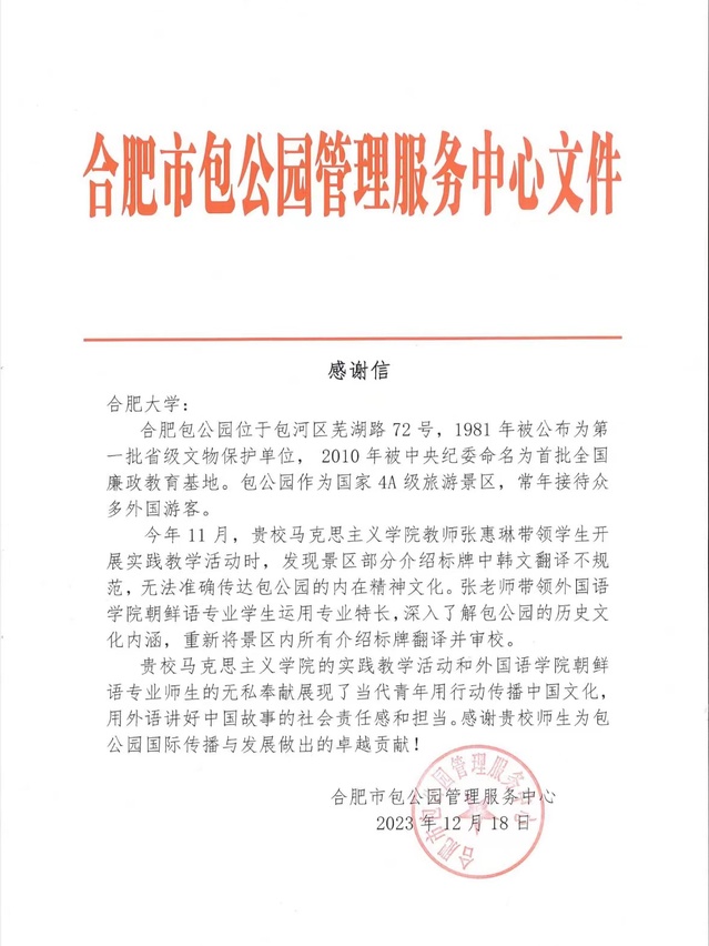 學生們通過此次活動,深刻感悟了包拯“孝忠、民本、剛正、清廉”的思想及中國傳統文化內涵,但同時發現景區部分介紹標牌外文翻譯不規范,無法準確傳達其內在的精神文化。教師在與景區管理服務中心溝通后,引導學生運用專業特長,以包公園的深厚歷史文化內涵為依托,重新將景區內所有介紹標牌翻譯并請專家審校。12月18日,合肥包公園管理服務中心向合肥大學發來感謝信,信中感謝馬克思主義學院的實踐教學活動和外國語學院朝鮮語專業師生的無私奉獻,贊揚我校師生用行動傳播中國文化,展現了當代青年用外語講好中國故事的社會責任感和擔當。 馬克思主義學院領導表示將繼續深入貫徹落實習近平總書記關于“大思政課”的重要指示,聚焦立德樹人的根本任務,推動用黨的創新理論鑄魂育人,突出實踐導向,充分調動全社會力量和資源,著力發揮校社聯合的大平臺作用,協力同行,譜寫大學生實踐教育高質量發展新篇章。(張惠琳/文圖 蘇冰/審核 武奎/編發) |