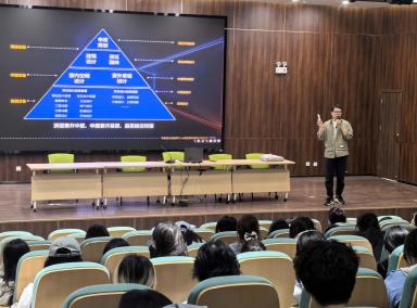 在第二部分“職業發展與跨界融合”的分享中,李淵濤先生結合自身從“平面+空間”的跨界融合,從設計師到設計總監的成長經歷,提出了“T型人才”培養理念。他指出,設計師既要深耕專業領域的“垂直能力”,又要培養跨專業、跨學科的“橫向視野”,因此學生們在校期間需要具備更開闊的視野和更復合的能力,不要囿于專業限制。