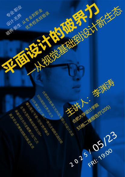 專業筑基,跨界賦能。為幫助視覺傳達設計專業學生深入了解行業發展,做好職業規劃,搭建校友與在校生交流平臺,合肥大學設計學院于2025年5月23日晚19:00,在院報告廳舉辦了“從專業到職業—優秀校友經驗談”專題講座。本次邀請了2009屆優秀畢業生、合肥思科智展文化科技有限公司設計總監李淵濤先生返校,以《平面設計的破界力—從視覺基礎到設計新生態》為題,為我院視傳專業學生帶來了一場精彩的專業分享。講座圍繞視覺傳達設計的專業特點、學科價值、發展趨勢以及學生的職業規劃等內容展開,為在場學生提供了前沿的行業解析與實用的職業指導。