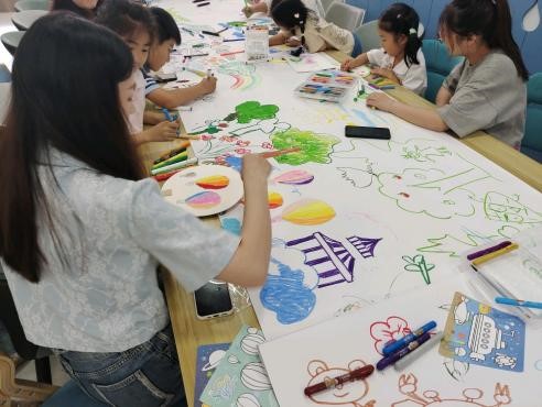 活動最后,所有參與者共同完成了環保主題的長卷繪制,學生黨員們發揮專業特長,與社區小朋友們一起繪畫,一起發揮想象力,在潔白的紙張上創造出各自心中的美好世界。這次繪畫活動不僅增進了黨員與小朋友們之間的交流和互動,還強調了共同為美好環境而努力的重要性。